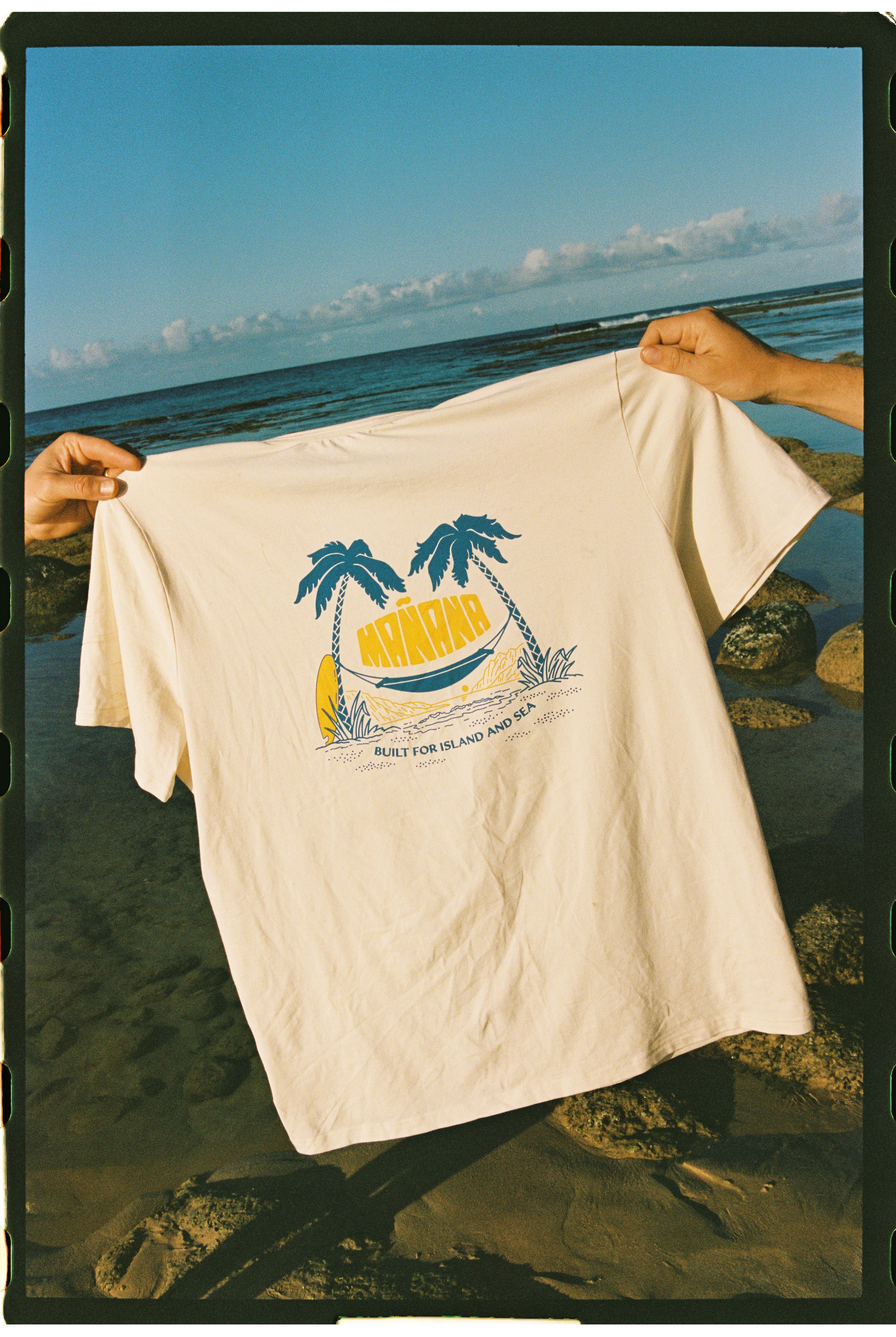 Relaxation can happen in many places, but few as comprehensive as the hammock. Feels best after a long day's surf. Chest and back graphic alterations on an Off White base color.