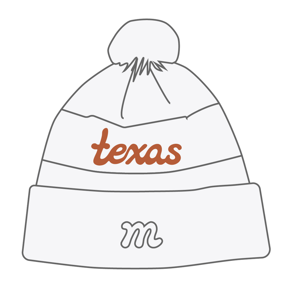 Featuring a burnt orange and off-white knit, a bold center stripe with “Texas” across it, and a playful pom to top it off, this beanie is warm, timeless, and made for game days and beyond.
